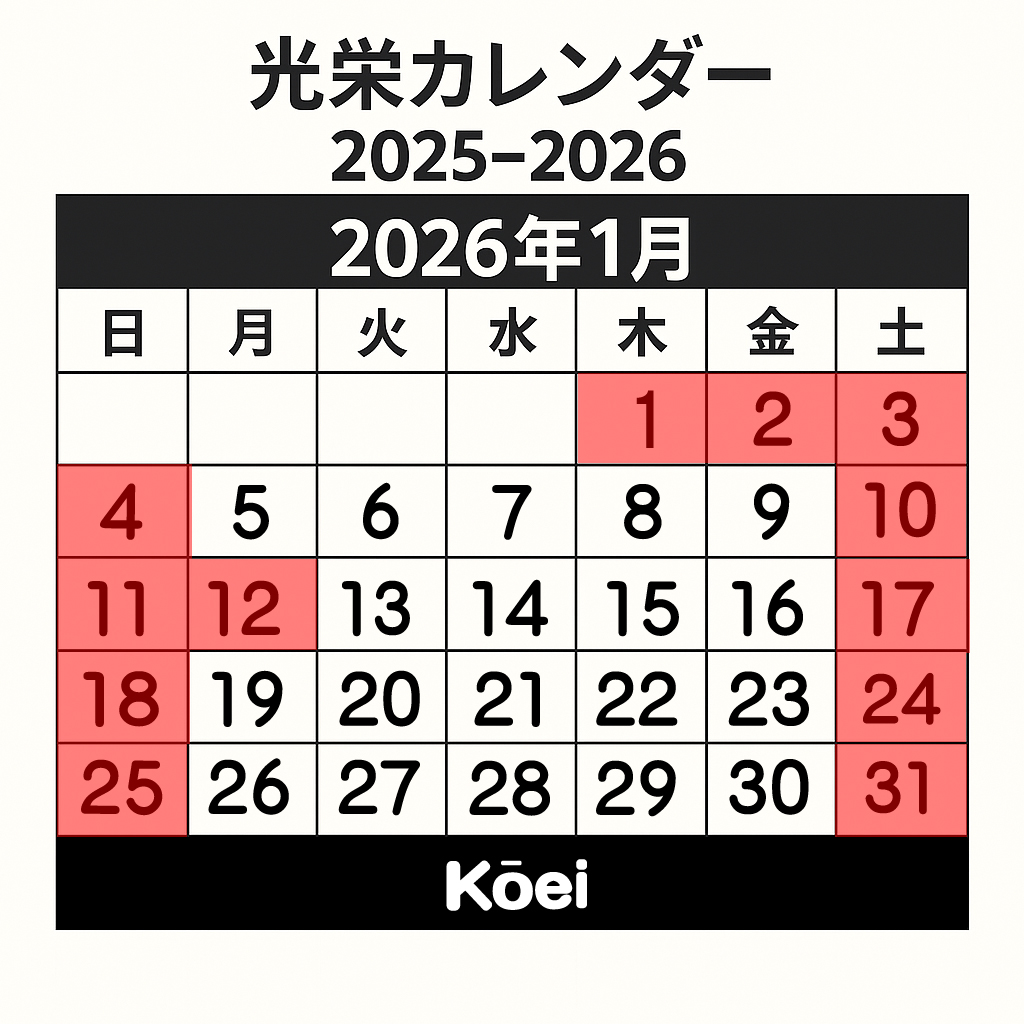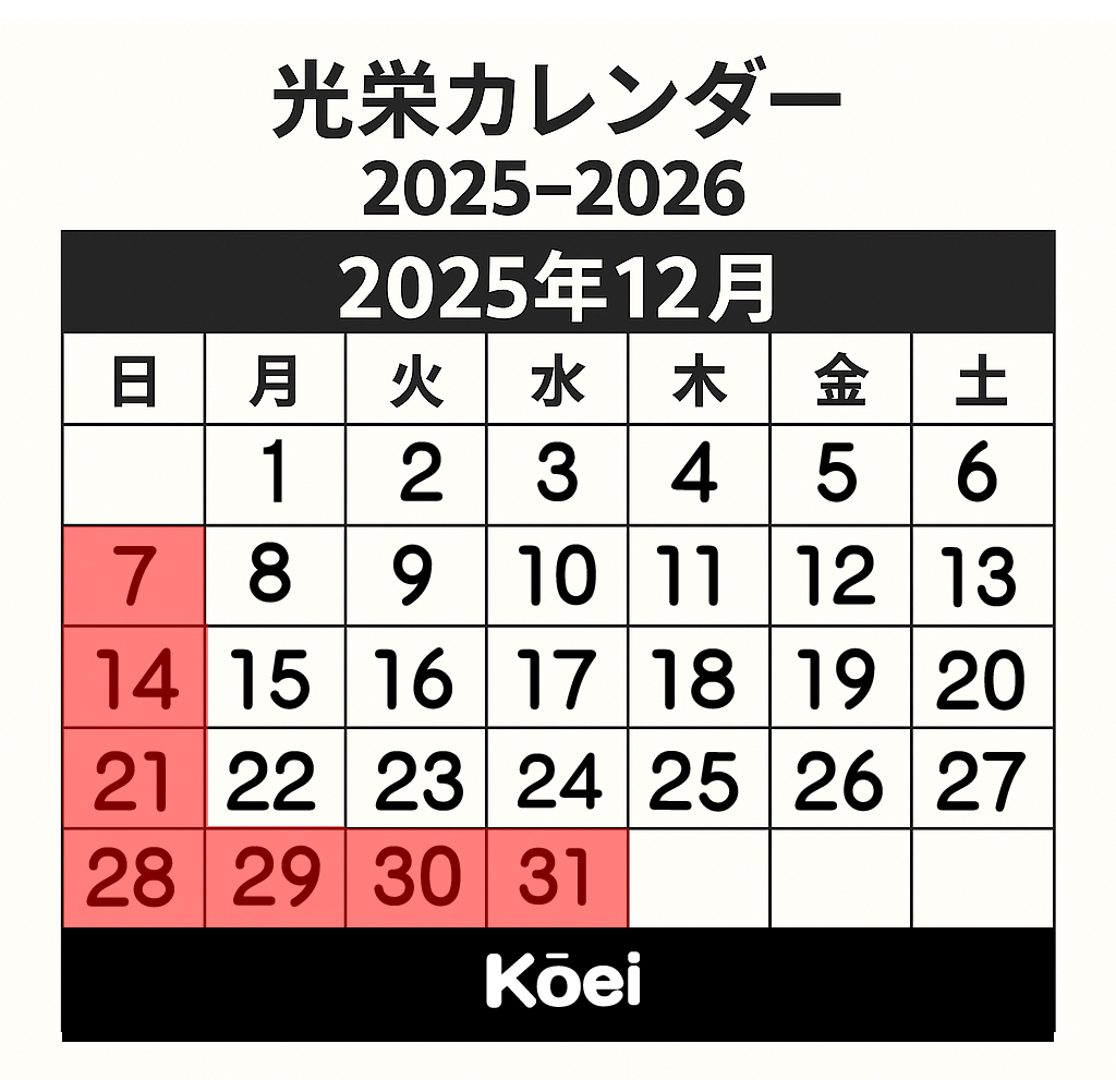 株式会社光栄です。12月~1月の休業日は下記の通りとさせていただきます。